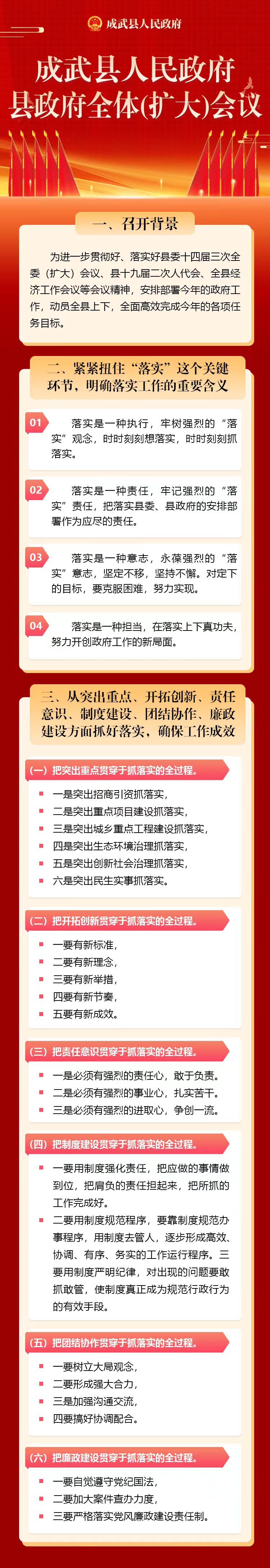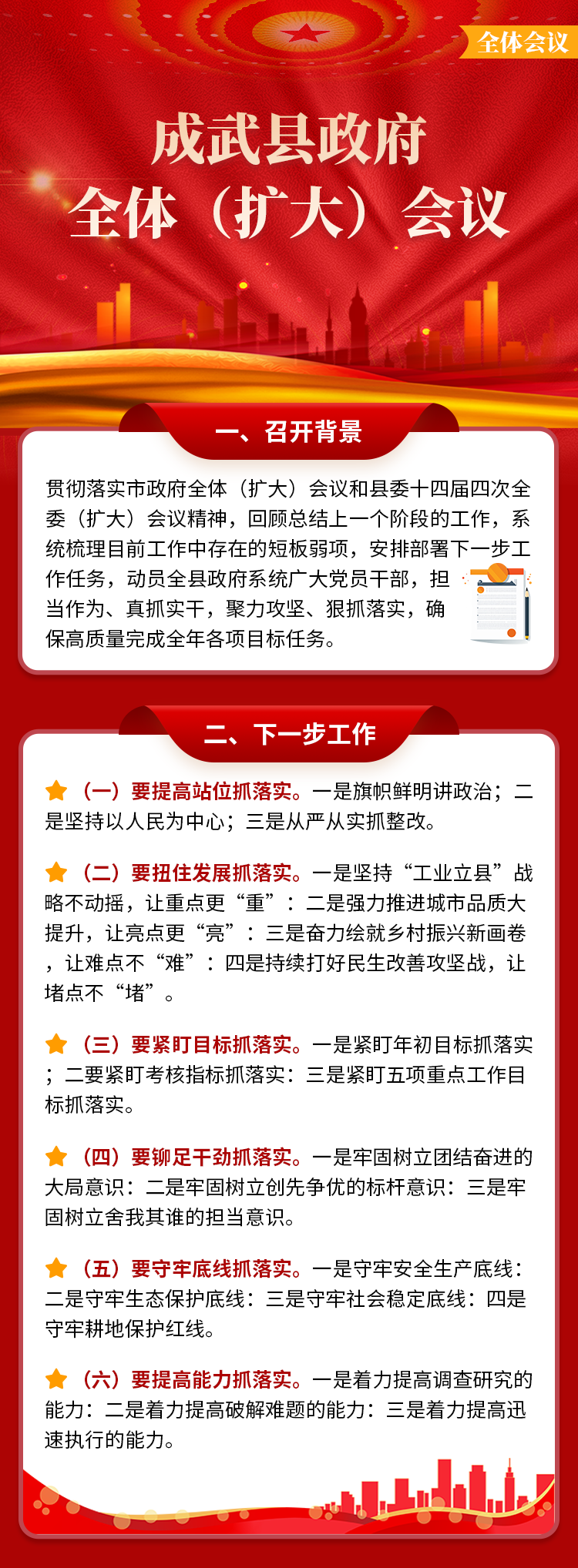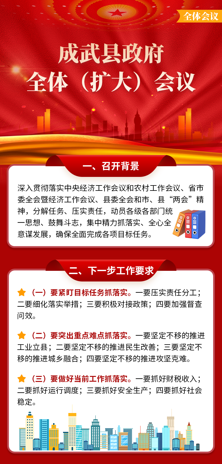 2月14日,縣政府全體(擴大)會議召開。會議主要任務是,堅持以習近平新時代中國特色社會主義思想為指導,深入學習貫徹黨的二十屆三中全會精神和習近平總書記視察山東重要講話精神,全面落實近期省市縣各項重要會議精神,安排2025年重點工作。縣委副書記、縣長范繼臣出席會議并講話,縣委常委、副縣長甘云建、王志鴻,副縣長邢印、李本君、許濤、孫玲出席會議,甘云建主持會議。范繼臣指出,當前,各項任務目標已經明確,新的一年,各級各部門既要看到風險挑戰、問題差距,更要看到機遇、增強信心,要堅持問題導向,聚焦短板弱項,靶向施策,攻堅克難,推動發展。要落實落細“錨定共同富裕目標推動全縣經濟社會高質量發展”動員會議精神,牢記會議指出的“五個信心”,心無旁騖、篤定前行,確保2025年各項工作開好局、起好步。范繼臣強調,要抓好財源建設,努力在稅源培植和強化征收管理上做文章,積極摸排,確保做到應收盡收;要抓好項目建設和企業培育,精準招大引強,聚力強鏈補鏈,積極跟進國家戰略和政策投向,增強發展動能;要實施好安全生產治本攻堅“九大行動”,持續深化“五項整治”,盯緊重點領域,全面做好風險隱患排查化解;要精細化整治人居環境,完善現代水網、高標準農田、四好農村路等基礎設施建設,抓好特色產業發展,全面推進和美鄉村建設;要高質量辦好民生實事,認真實施教育、醫療、養老等重點領域民生項目、全力兜牢民生保障;要瞄準城市建設“六個必須”“五項提升”目標任務,加強城市精細管理,健全完善現代化城市規劃,提升城市形象;要推動招商引資提質、消費活力提升,同時抓好經濟運行,全程跟進擬升規企業培育壯大;要持續優化營商環境,緊緊圍繞企業所需、所急、所盼,主動對接、積極作為,切實解決企業實際問題。會上,各位副縣長分別就各自分管工作進行安排。會議還同步下發了關于落實全市重點項目、重點工程、重點事項、重點任務及全縣經濟社會發展責任目標分工方案。